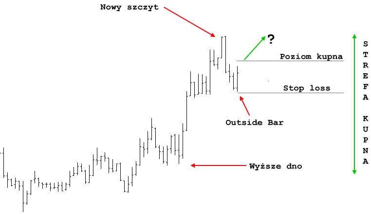 Outside Bar sugeruje możliwe zakończenie korekty. Pewności nie ma i właśnie dlatego czekam na potwierdzenie (czyli przełamanie poziomu kupna). Banalny sposób na ograniczenie ryzyka.