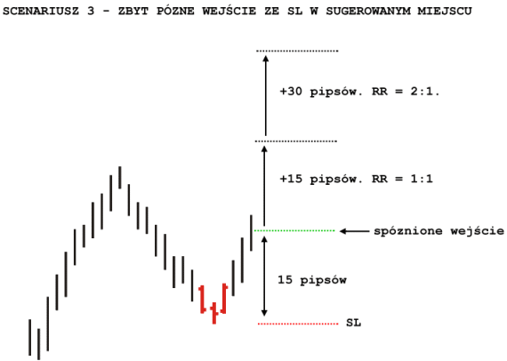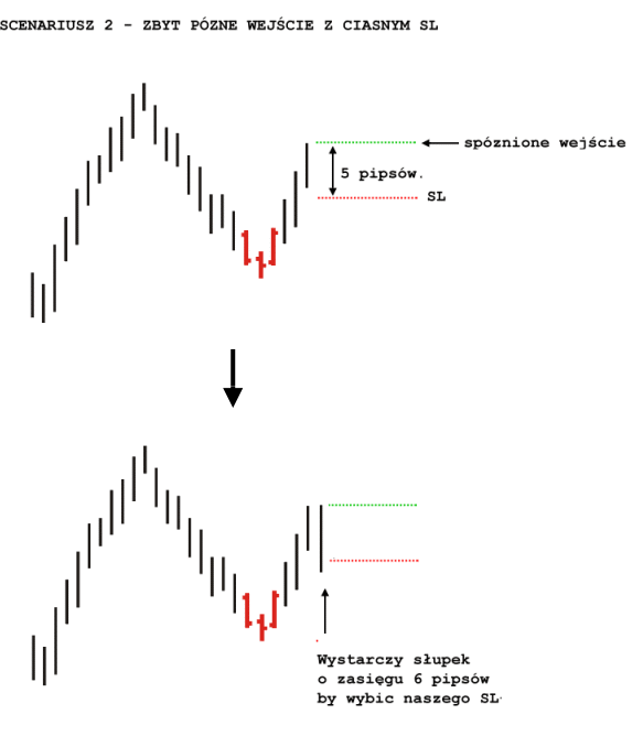 Wejście w odpowiednim momencie daje możliwość ustawienia ciasnego SL. Późnejsze wejście pozbawi Cię tej możliwości. O ile początkowo SL mógł wynieść kilka pipsów, teraz musi być ustawiony w odległości kilkunastu pipsów.