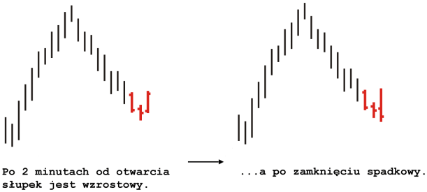 Wchodzenie przed zamknięciem jest kuszące. Grając np. na interwale pięciominutowym po dwóch minutach aktualny słupek może wyglądać na wzrostowy. Wtedy włącza się chciwość: To jest to! Kupuję bo pipsy uciekną!!!